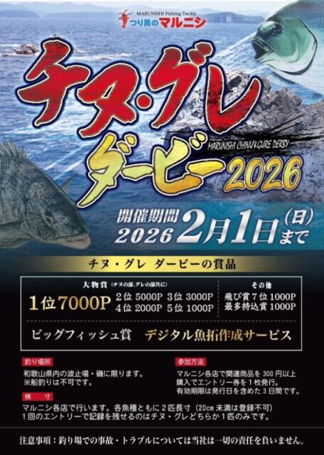 なお、つり具のマルニシで開催中の「チヌ・グレダービー」は、いよいよ2月1日(日)が締め切りです。自慢の釣果が出たら、ぜひエントリーを忘れずに!