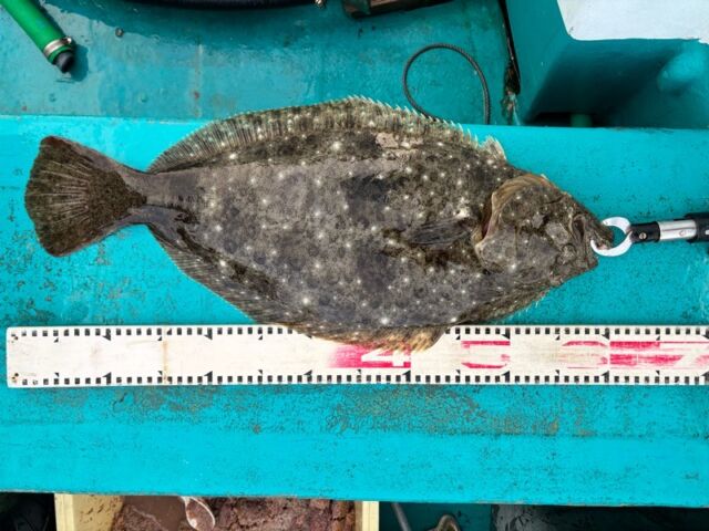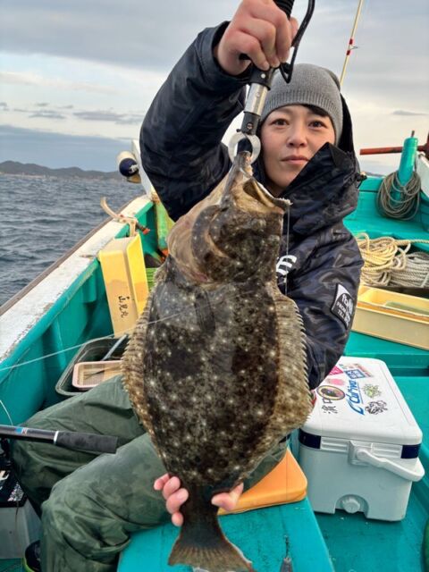 ヒラメ 60cm: 酒本氏が湾内でキャッチ。エサは活きアジ。湾内でこのサイズが出るのは、まさに美浜のポテンシャルの高さの証明です。
