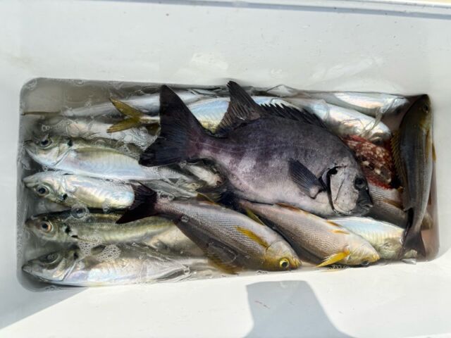 マアジ・マルアジ 26〜32cm: 30cm前後の良型が15〜20尾と安定。そのままお土産にしても良し、大物のエサにしても良しの「わらしべ長者」釣法がズバリ的中しています。