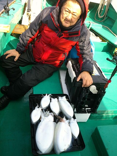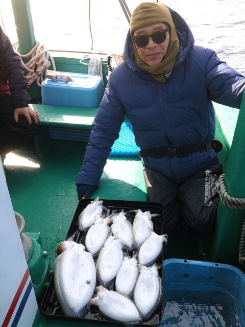 グッドな重量感: 1月27日には船中全体で34杯の釣果。なかでも1.2kgのビッグサイズが登場し、現場を沸かせました。スミイカ、モンゴウイカともに型が良くなっており、ズッシリとした重量感を楽しめます。