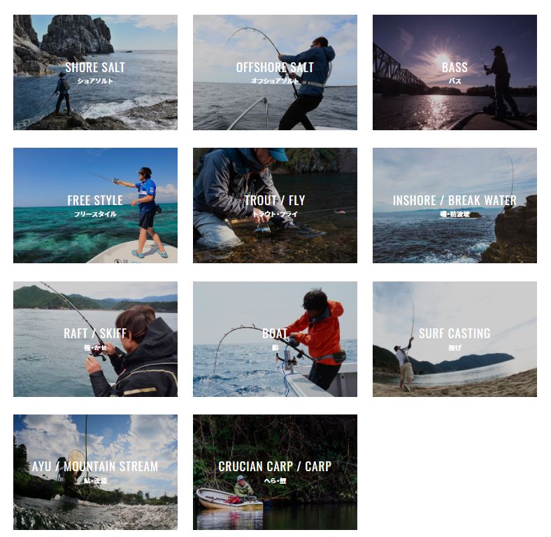 このページでは、知りたい情報にアクセスしやすいように、釣種別、製品別に選べるようになっています。