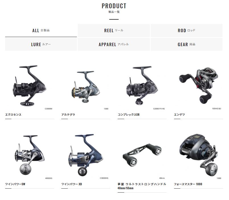 製品のジャンル分けは、「全製品」「リール」「ロッド」「ルアー」「アパレル」「用品」の全6カテゴリー。