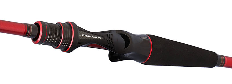 2026年3月発売予定の専用竿。継部にV-ジョイントを採用し、センターカット2ピースながら美しい曲がりを実現しました。未搭載の従来モデルに比べ、パワーや曲がりからの戻りの早さが向上しています。エアセンサーシート搭載で軽量化と高感度を両立。