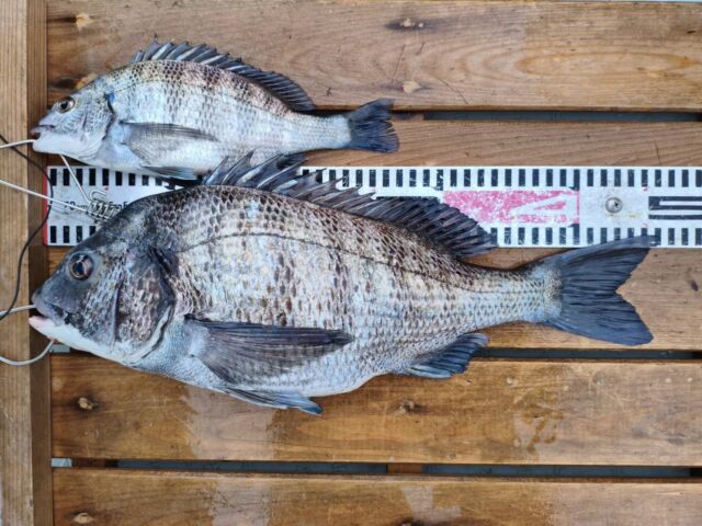 冠者島の筏で、オキアミのエサでチヌの46cmと27cmの2尾を見事にゲットです。