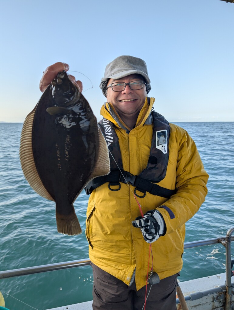 手にする釣り人の表情が物語るように、満足感十分の立派な大型カレイです。