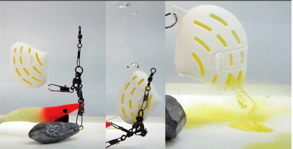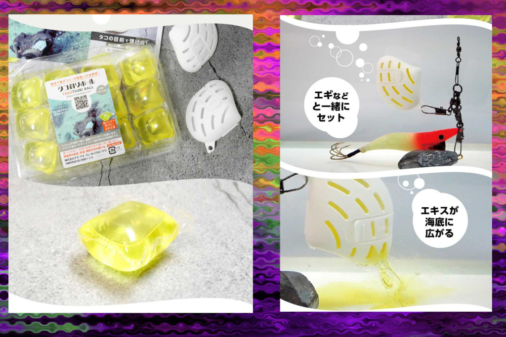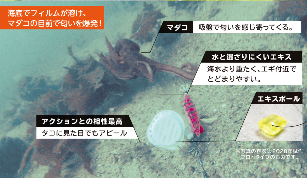 タコが好むアミノ酸や魚介のエキスが入った誘引剤を特殊なフィルムで包んでいます。