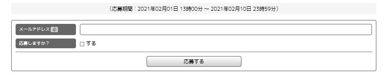 抽選後、当選者には「当選のお知らせ」が届くそうで、住所、氏名、年齢、電話など必要項目を記入の上、メールに記載されている期限内に返信すればOKだそうです。