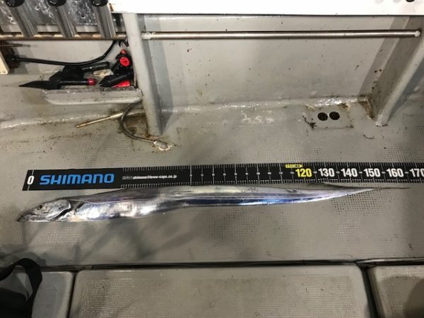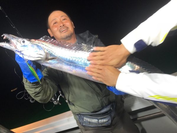 メタボスイマー160gを使っていた同行の長尾氏にナントびっくり、全長165cm、指10本の、神龍サイズ!?のタチウオが釣れたそうです。