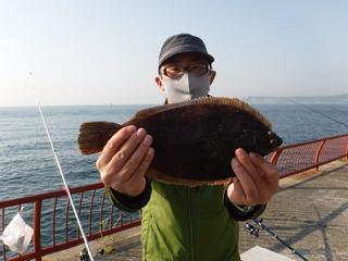 3月1日由良氏アイナメ38cm、松本氏アイナメ35cmとカレイ27.5cm。