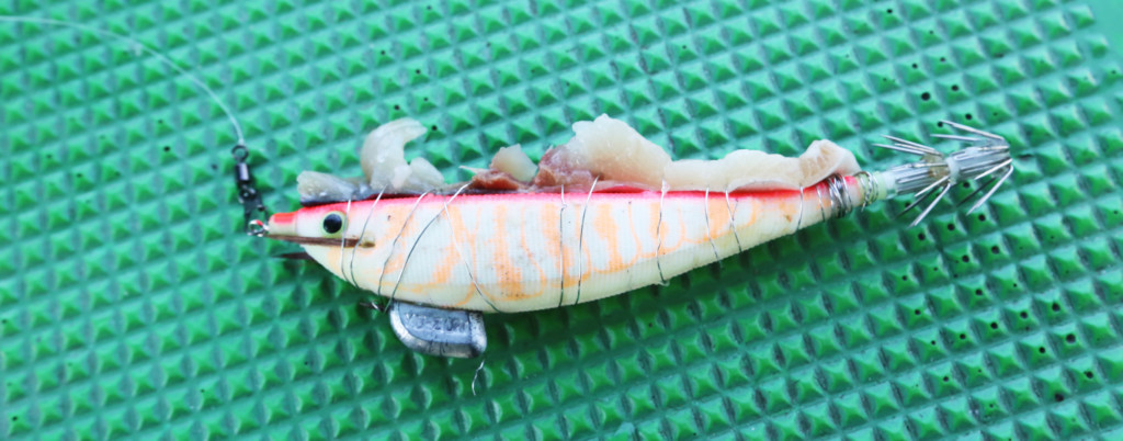 また、後半に数を伸ばしていたのはエサ巻きスッテを使用していた人。前半、「あまりアタリがでない」と言っていたが、エサ巻きスッテにかえてからは、よくアタっていました。エサ巻きスッテは、ササミや魚の切り身を使います。この日はサバの切り身が効果アリでした。