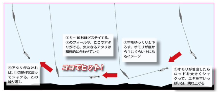 ①オモリを着底させて糸フケを取れば、胴突きの場合は捨て糸分、中オモリの場合は1mほどオモリを浮かせて、ロッドを大きくシャクってエギを竿いっぱい分跳ね上げさせる
