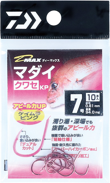 D-MAXマダイ クワセ KPは、天ビンズボやフカセ釣り、胴突きなどのマダイ狙いに適したケイムラピンク仕様のマダイ針です。