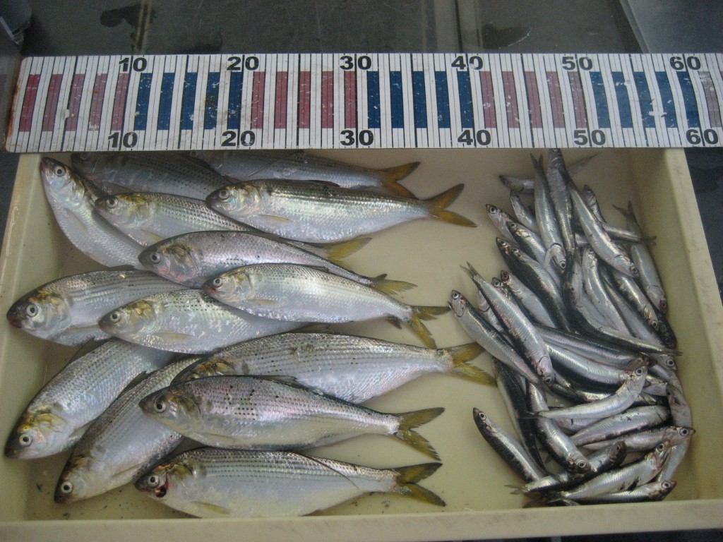 坂越周辺でコノシロ30cm頭に30尾とイワシ25cm頭に20尾。