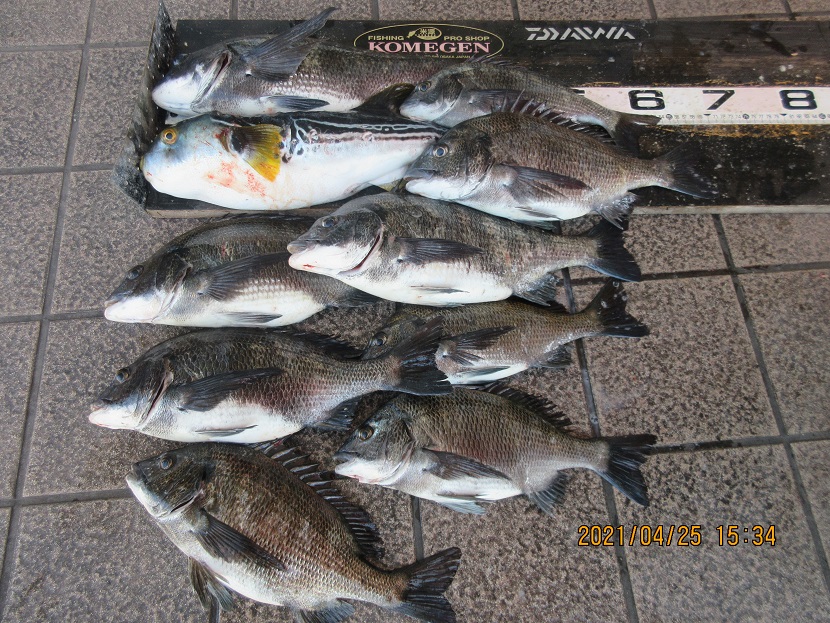 4月21日赤松氏メバル20~23cm4尾、美野氏チヌ30~41cm6尾。