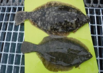 4月23日道島氏マダイ34.5cmとカレイ38cm、扇谷氏カレイ40.5cm。