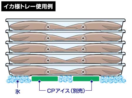 トレーの使用方法は、下に氷や保冷剤などを敷いておき、その上にトレーを置いて釣れたイカは重ならないようにキレイに並べていけばOKです。