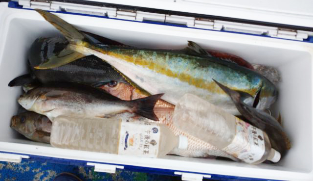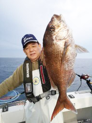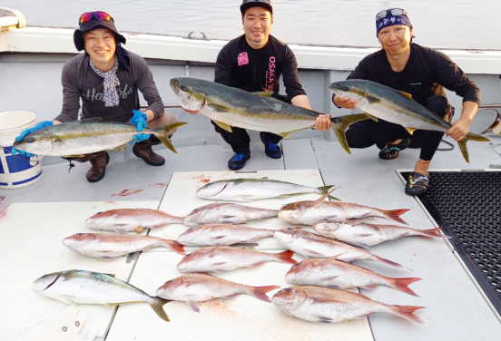 序盤はイサギが連発して、なかなかヒラマサの口にエサが届かなかったようですが、その後にヒラマサがヒット。船中ではヒラマサのほか、マダイ、イサギ、グレ、ウマヅラハギと賑やかな土産になっていました。