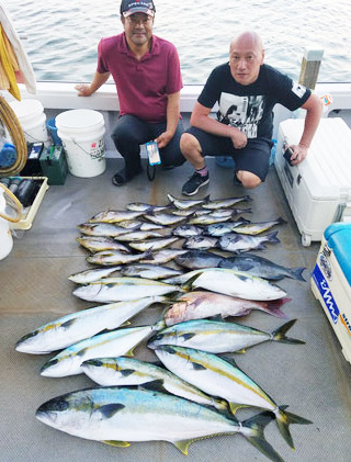 6月16日は2人でヒラマサ71~101cmを4尾とマダイ54~78cm12尾にイサギ35~50cm15尾とサンバソウ36cmに34cmとグレ36cmの釣果。