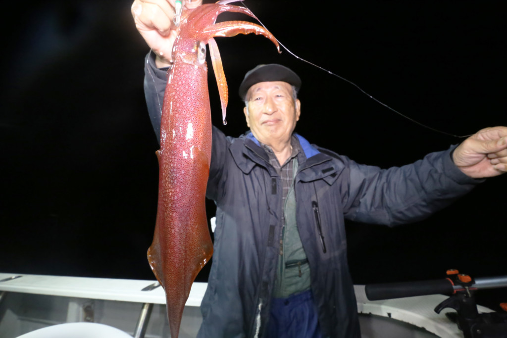 ここからは、大人の夜遊びタイム。狙うターゲットはシロイカだ。イカ釣りでは、胴長30cmオーバーのシロイカなどが釣れて半夜釣りも楽しんだ。