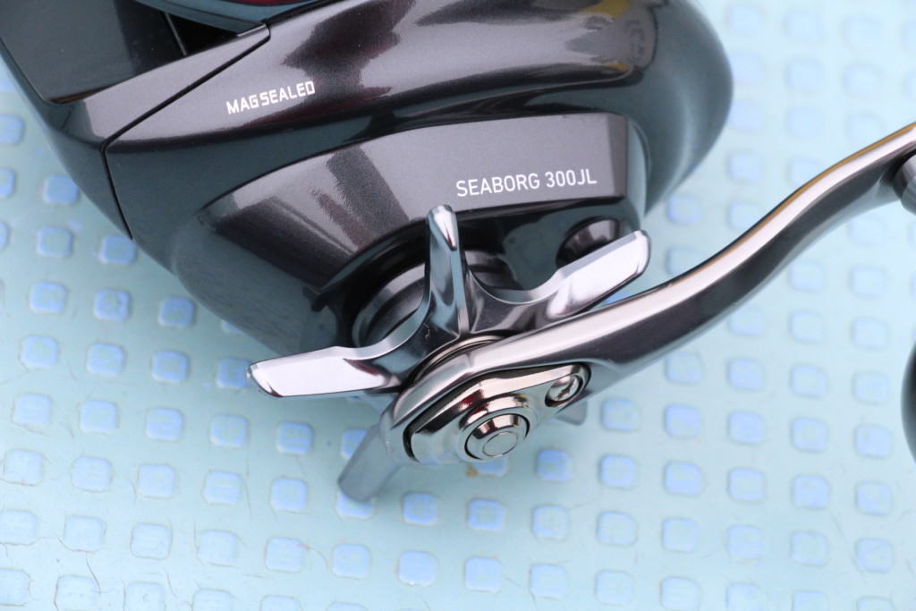 アルミ製のJOGパワーレバーなので、指への掛かりがよく、濡れた指先でも繊細な巻き上げ操作、瞬時の巻き上げ速度チェンジも可能で、ベイトを付ける時だけでなく、掛けてからの大物とのやり取りにもバッチリ対応できます。