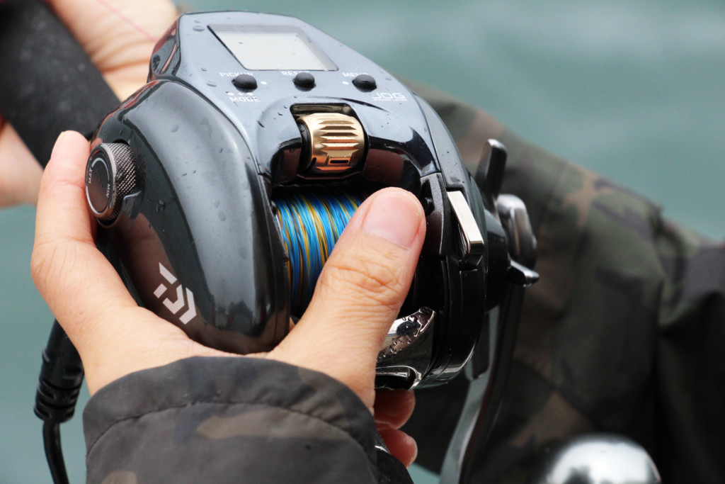落とし込みは、第一段階で、ベイトとなる小魚を仕かけの針に付けます。これにはベイトのタナ間で仕かけを上げ下げするのですが、ベイトが付きにくい時には何度もそのタナでの上下を繰り返します。クラッチのオンオフが片手で、そして巻き上げまでもその指で操作できるのは、手返しの点で圧倒的なアドバンテージです。
