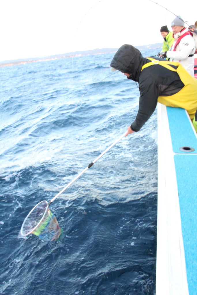 最後は船長さんやお隣さんにタモですくってもらいますが、海面まで浮かせたヒラメの頭からタモに滑らせるように誘導してネットインしましょう。