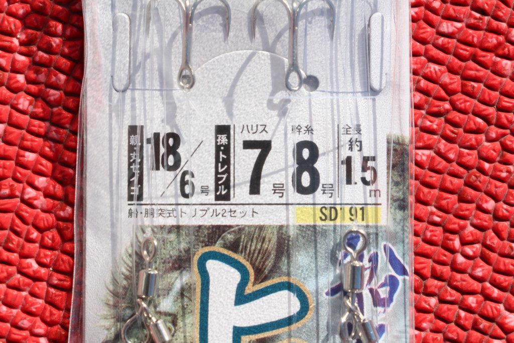 孫バリ(写真はトリプル)の腹掛け。エサのサイズや親・孫間の距離によって、刺す位置は調整する