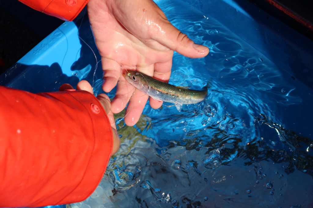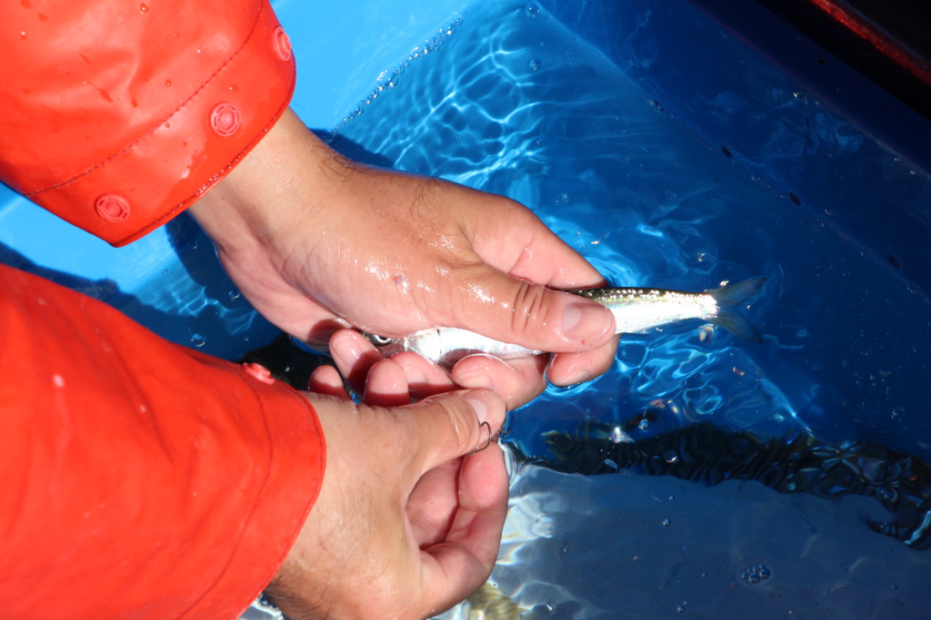 釣り方を説明します。エサとなるのは生きたマイワシ。マイワシをハリに付けて泳がせ、それを食うヒラメを釣るワケです。