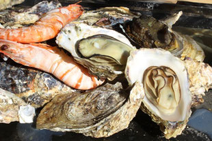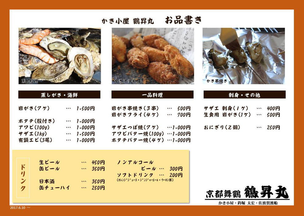 蒸しガキ、生食用岩ガキ、カキフライ、アワビ、サザエ、など