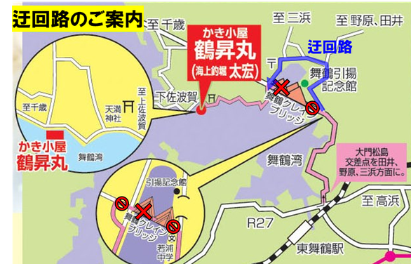 ※主要アクセスとなる舞鶴クレインブリッジが、現在は補修工事のため全面通行止めになっているので、迂回路の利用となります。