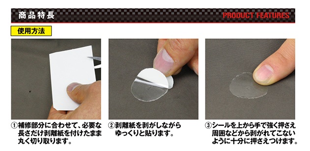 対応素材は布、皮革、合成ゴム、ビニール、プラスチック等幅広い素材に貼り付け可能で、使用方法も補修部のサイズに合わせて丸く切り取り貼るだけでOK!