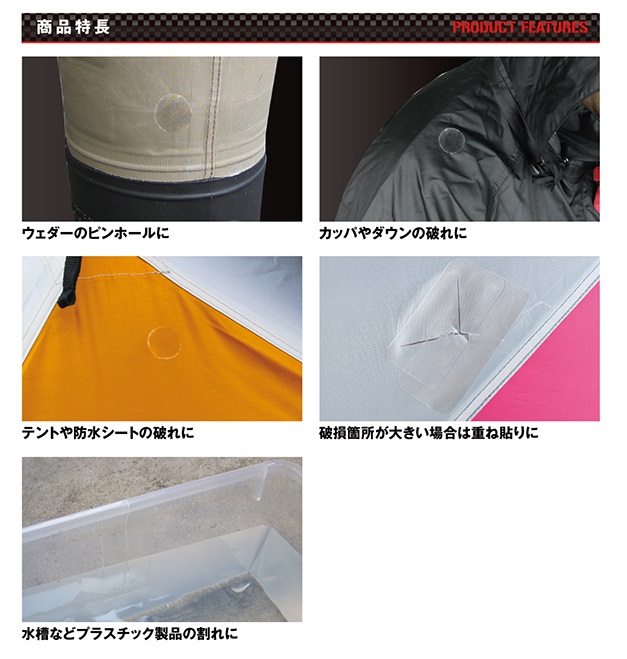 耐水・耐熱で強力な粘着力を発揮するので、ウェーダー以外でもテント等のアウトドアギアにも使用できる便利アイテムとなっています。
