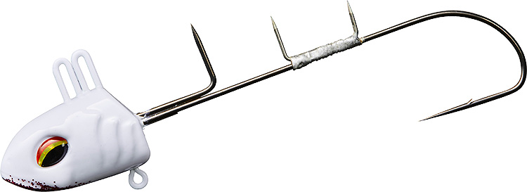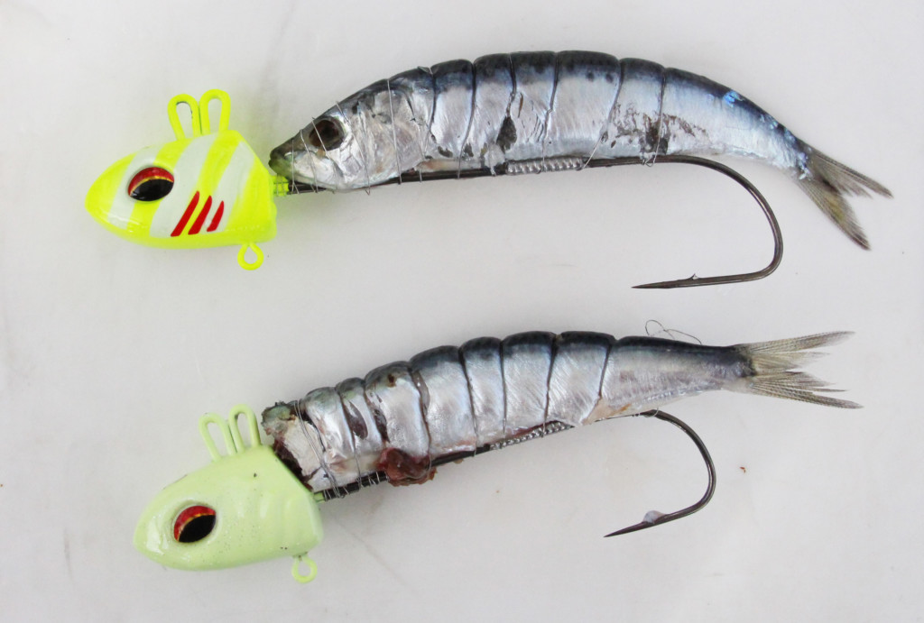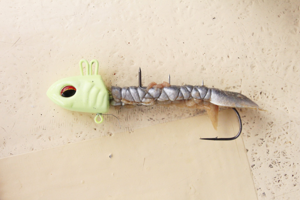 通常は1尾そのまま使用しますが、小型が多い時や食い渋ってシルエットを小さくしたい時は針もミドルフックのものに、イワシは頭を落として針の軸から少し尾が出る程度に付けます。