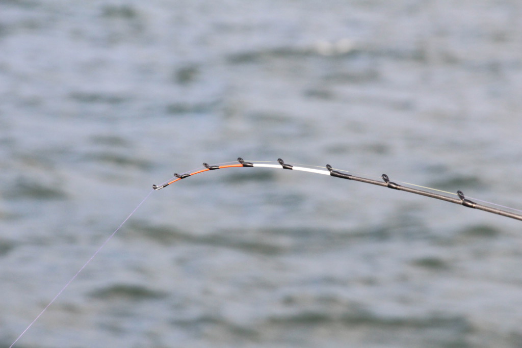 →ハンドルを巻く。ここでクッと穂先が入れば、即アワセ。これは居食いの時にでるアタリに多いそうで、巻き速度を上げることでテンションが掛かり穂先が入るとのこと