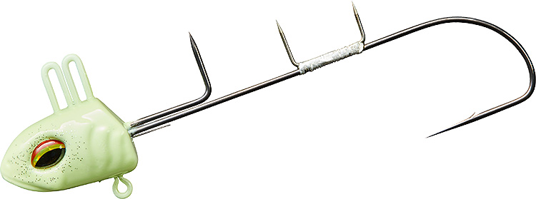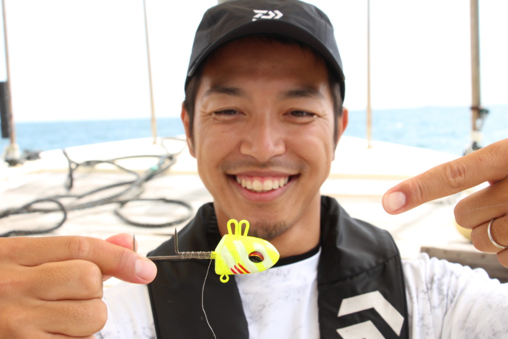 このテンヤは、サルカンを接続するアイの位置により、テンヤの姿勢をかえることができますが、西村氏は基本的に前方のアイに接続するバトルモードで狙っています。