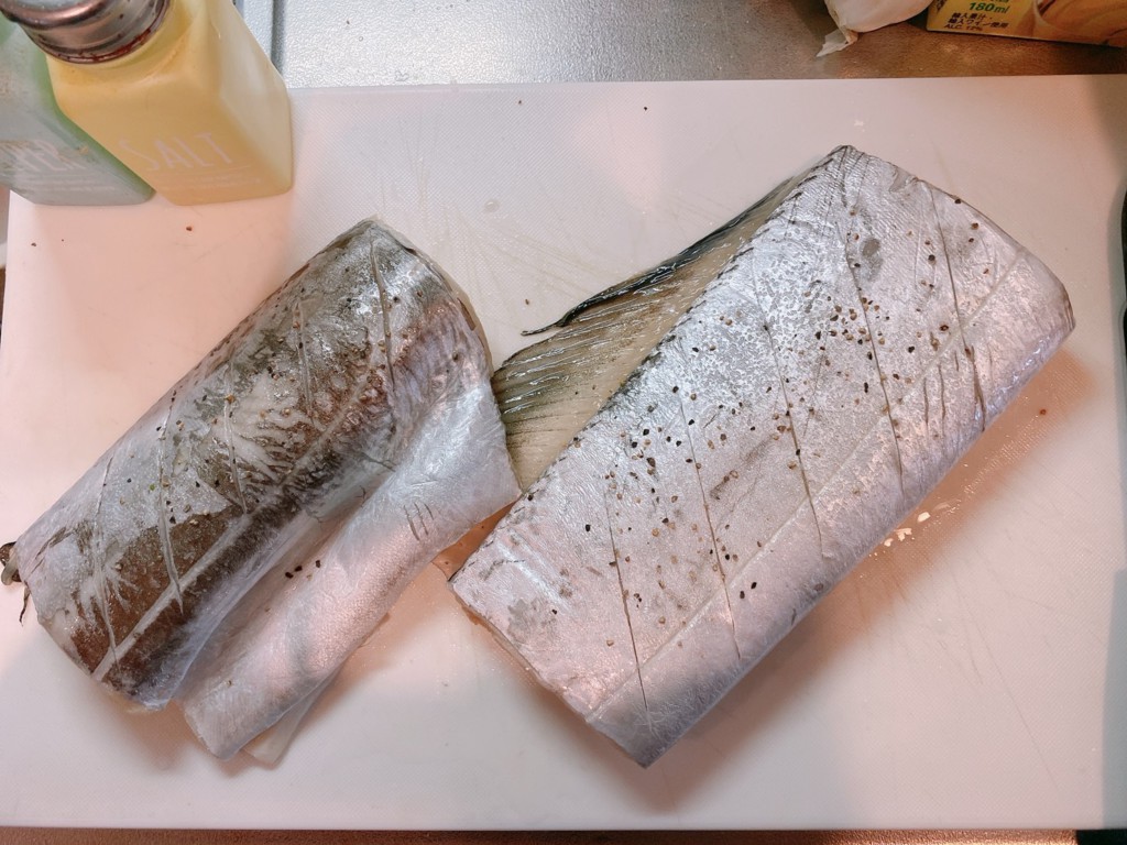この時、タチウオの表面に少し包丁の切れ目を入れておきます。