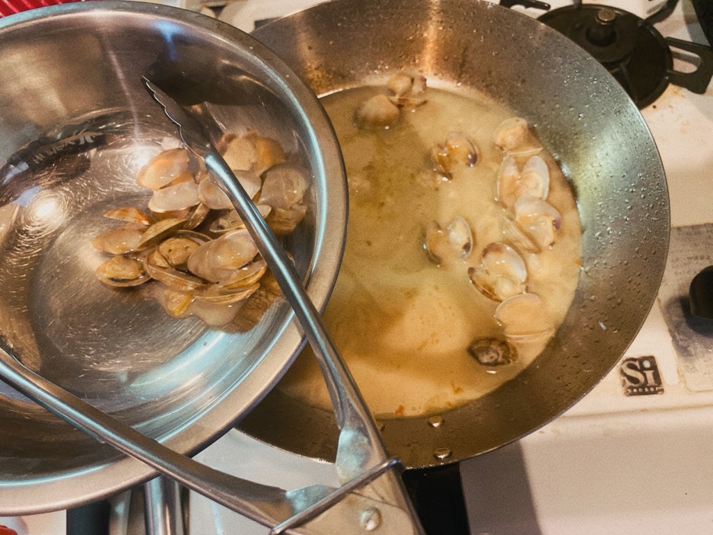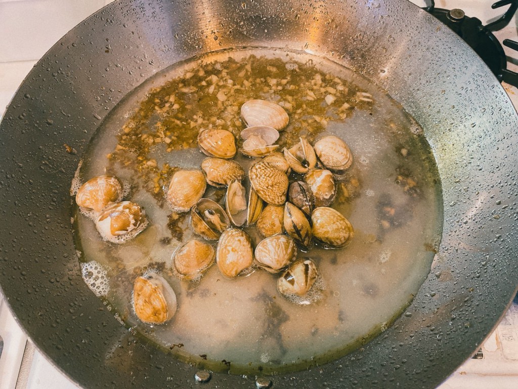 アサリは火が通り過ぎてしまうと固くなってしまうので、一度取り出すのがポイント!
