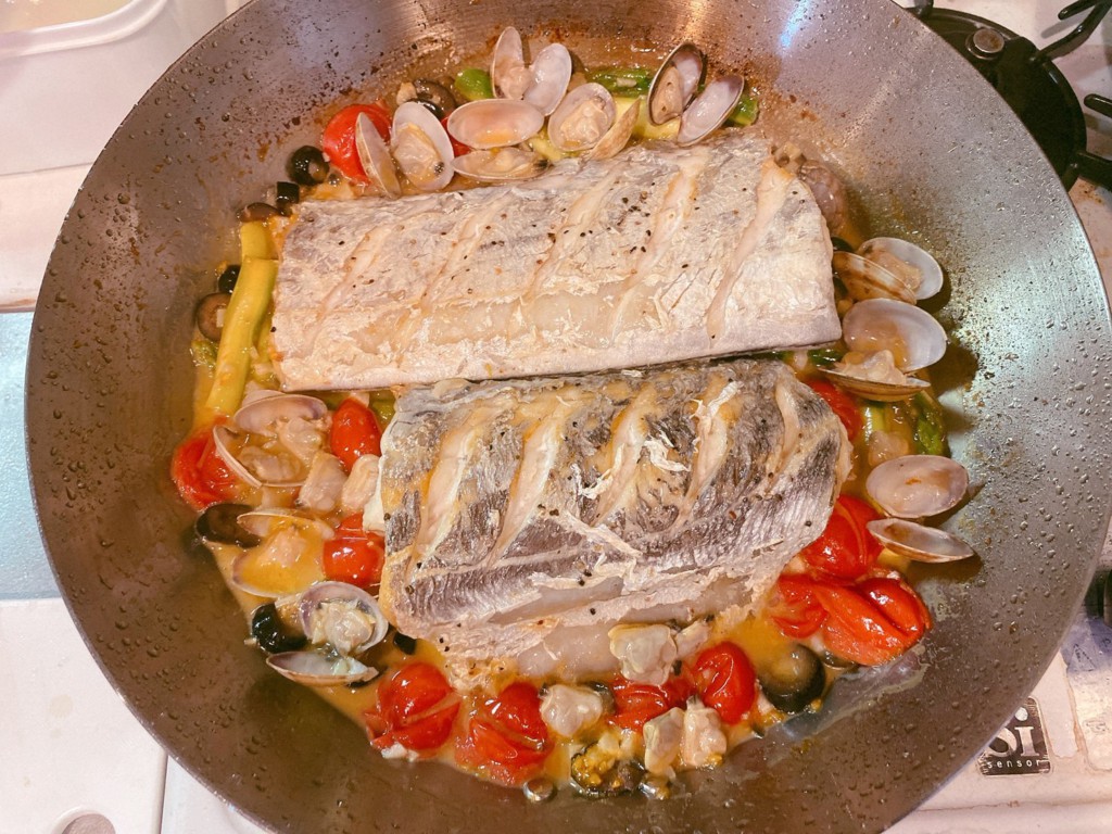 フライパンにタチウオとアサリを戻し、中火でスープに絡ませます。