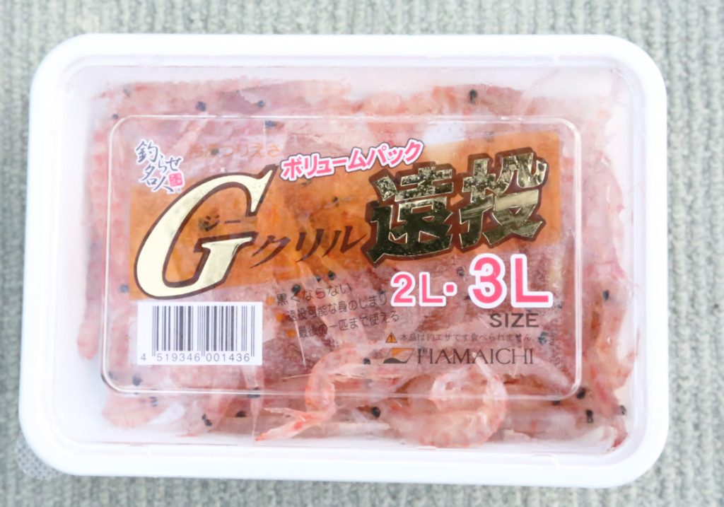 オキアミはLサイズを用意しておくのが一般的。また、ボイルではなく、生を選ぶのがオススメです。1日釣行するなら、3kgを4枚程度、半日なら2枚程度あればちょうどよい量となります。