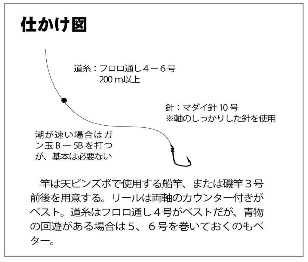 ハリスは4号でマダイ針は10号程度でよいでしょう。状況により青物の回遊もあるので、6号のハリスを用意しておくのもベターです。