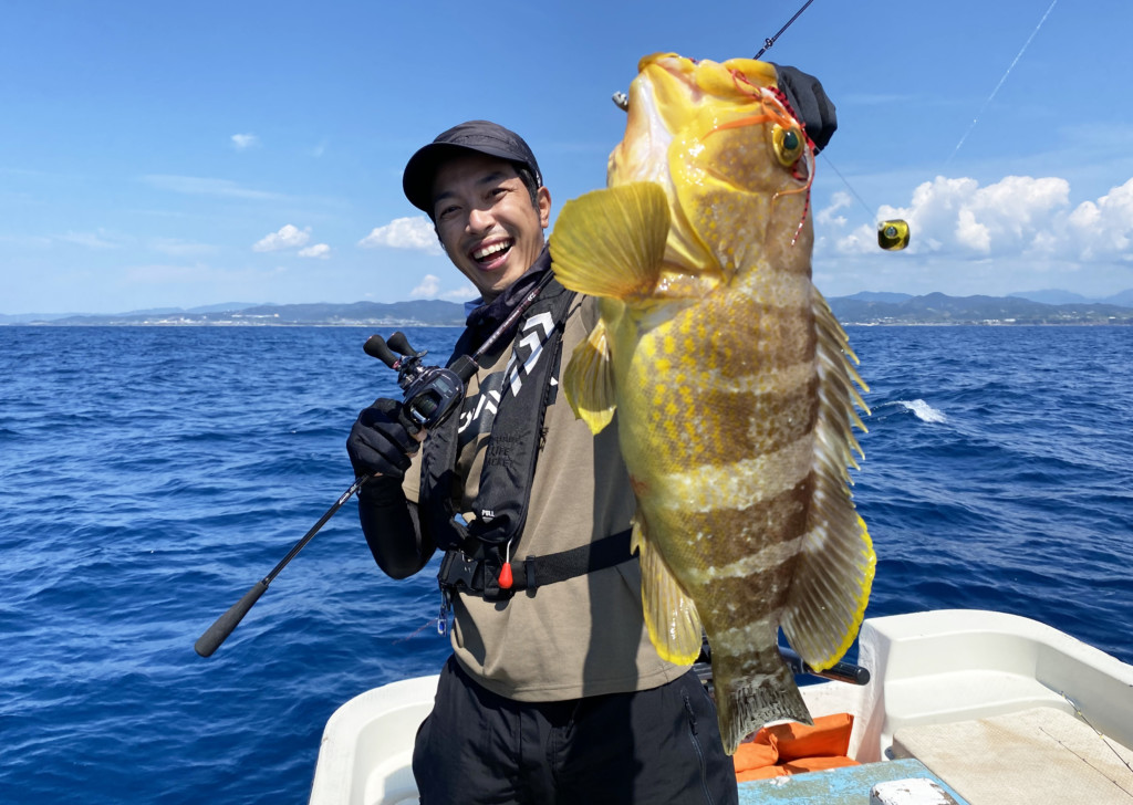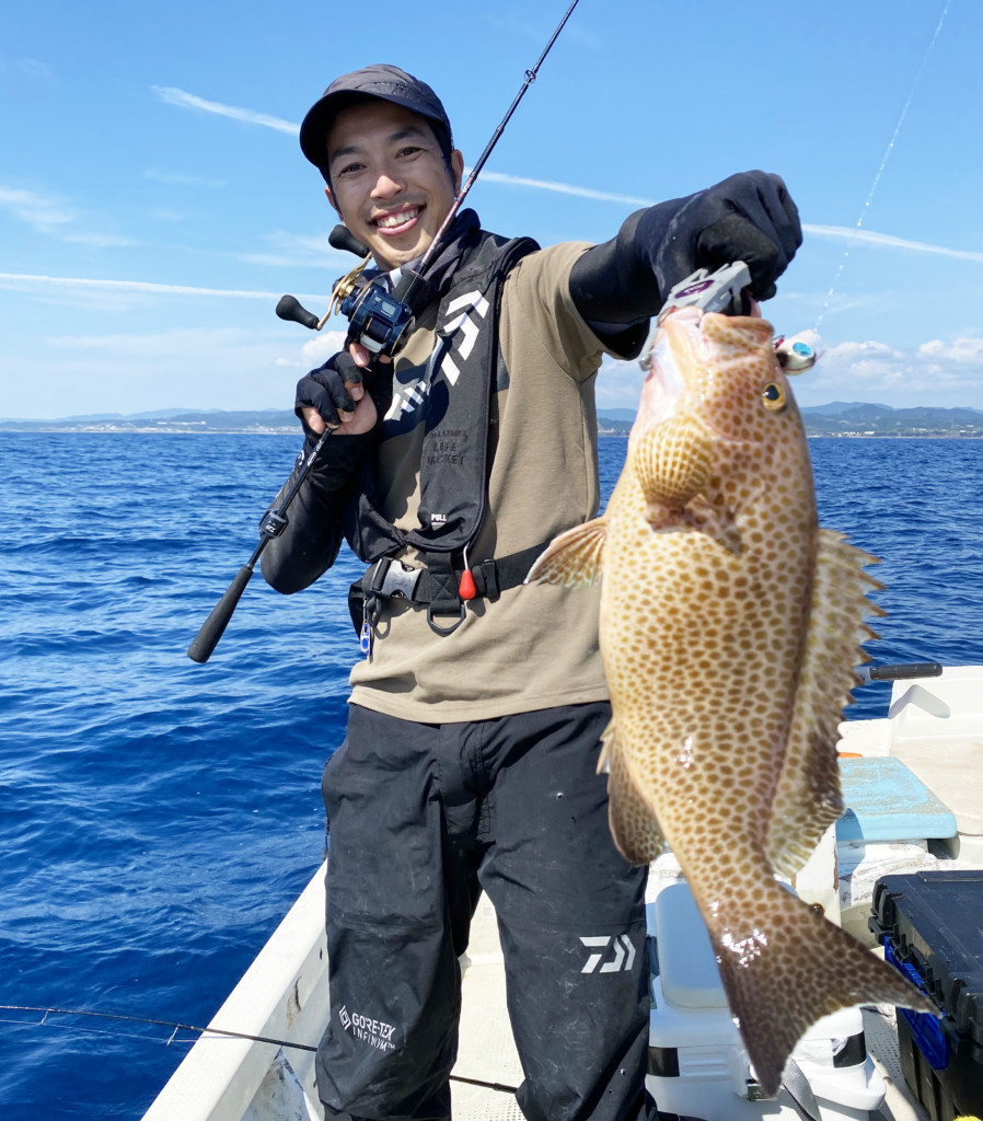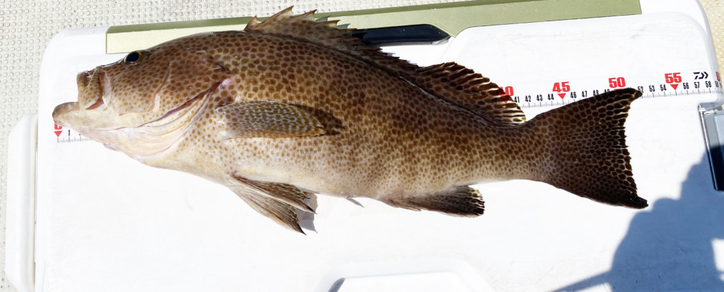 すると、これが大当たり! 52cmと当エリアでは最大クラスとなるオオモンハタをはじめ、アオハタ、アカハタなどの根魚、サイズは小さかったもののマダイやチダイ、メイチダイ、さらにはSLJには反応のなかったハマチまで、次々と竿を絞り込んでくれました!