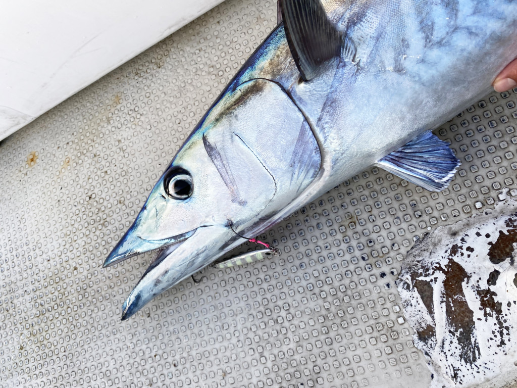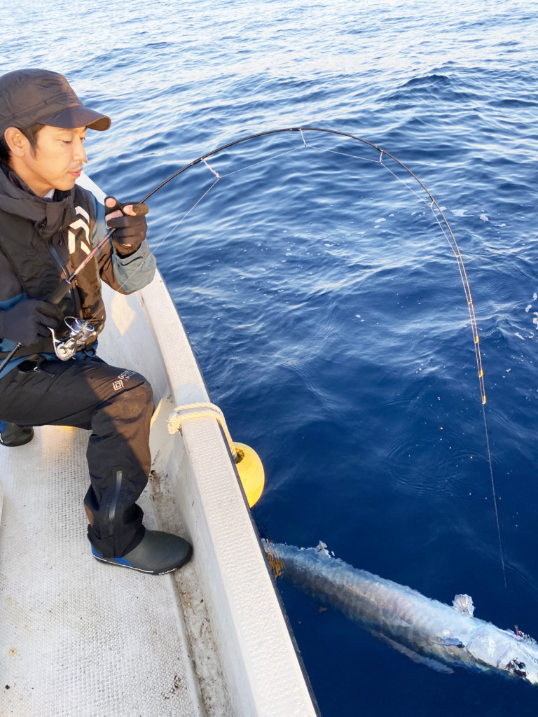 朝イチはSLJからスタート。TGベイト60~80gで、底から20mほどを高速タダ巻き中心で探っていきます。すると、まさかまさか、開始10分でいきなりドラグを唸らせるビッグヒット!