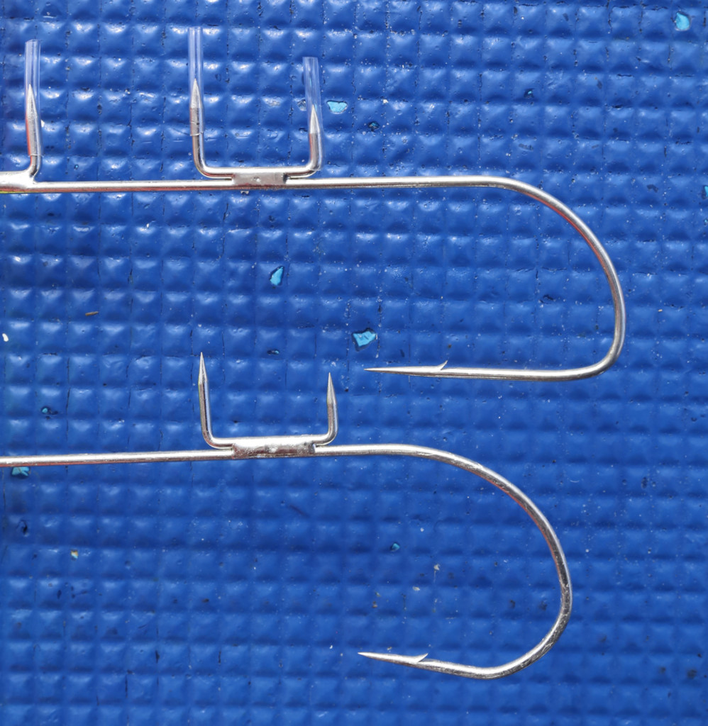 一方で新たに発売された「ゲキサス」は写真下側のフック形状。比べると、形状が違うのが一目瞭然。上は針先がストレートになっていますが、ゲキサスはやや内側に入って、針先がねむっています。