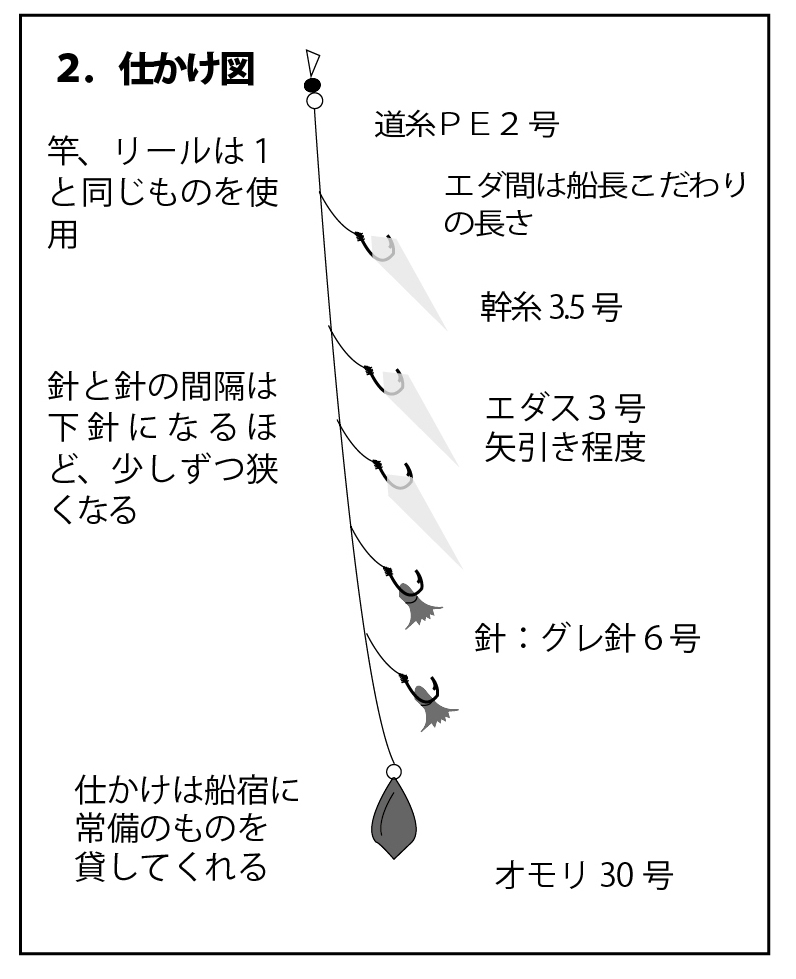 オモリの下に針が2本付いている。オモリは20号を使用。タイカブラのような仕かけで、底付近にいるマダイを狙う