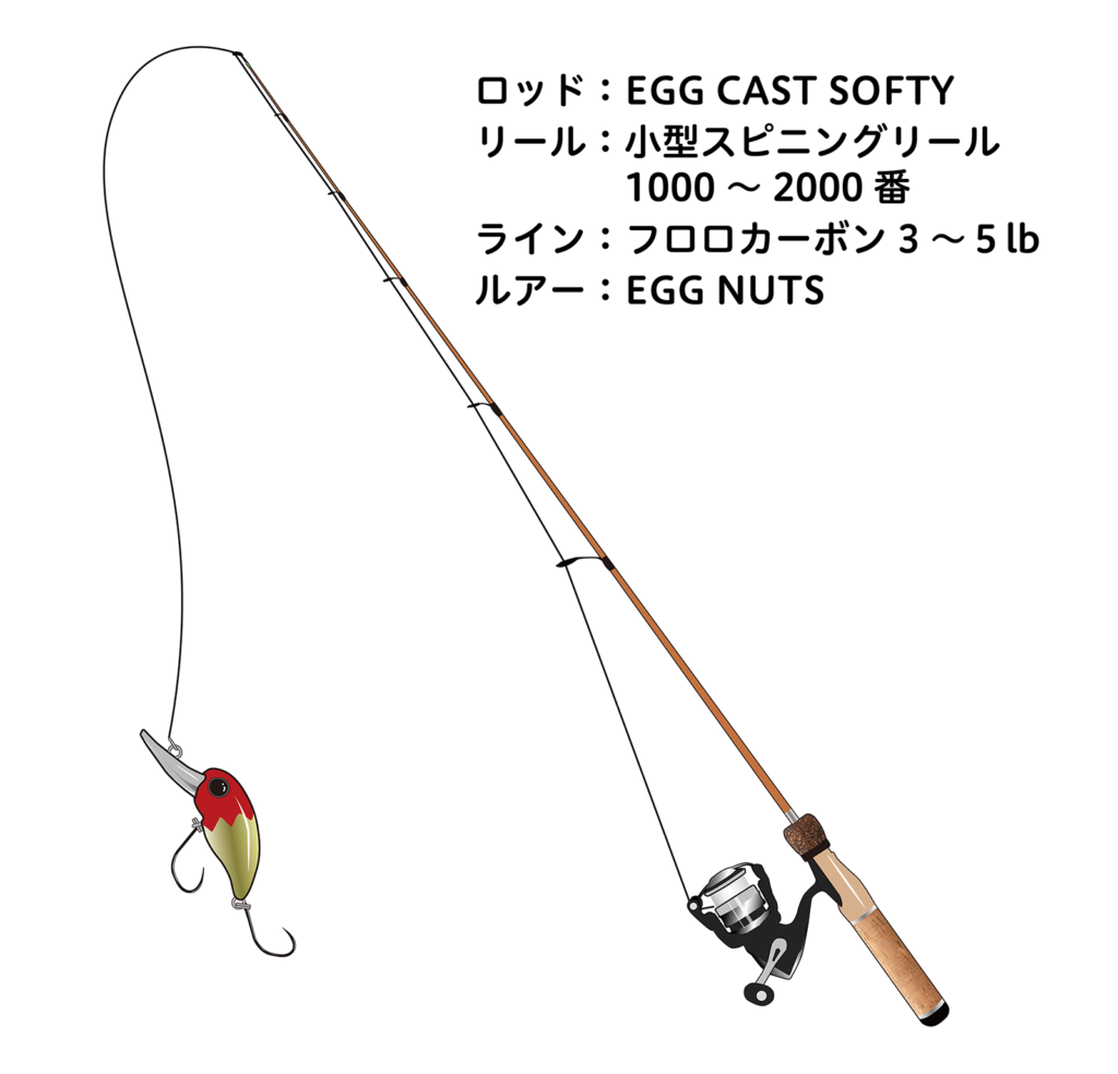 タックルも、ブラックバス釣り用の軟らかめのスピニングタックルや、エリアトラウト用、アジングなどのライトゲーム用で代用可能。