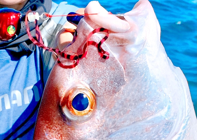 澄み潮には、シルエットのハッキリした赤や黒が定番である。私はレッドゼブラの「コブラカーリー」を、仲さんにはレッドゼブラの「コブラ・スリムカーリー」をセットしてもらい、フックはともに金龍鉤の「鯛ラバ専用アシストフック(バーブレス)」を1本針仕様でセット。同じレッドでも、この日はアピールの強い太身がよいか、細身がよいかを見極めたかった。