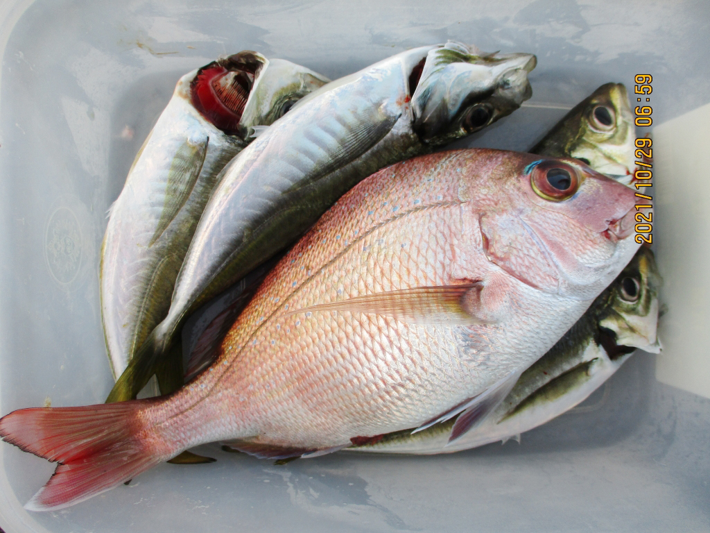 アジ12~28㎝330尾とマダイ12~20㎝20尾にチヌ48㎝と35cmにカワハギ13~23㎝30尾。