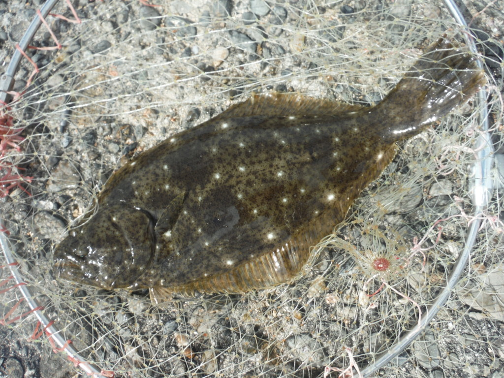 底を這うような引きを見せて上がってきたのは、何とヒラメ。メジャーで測ると、39cmあった。