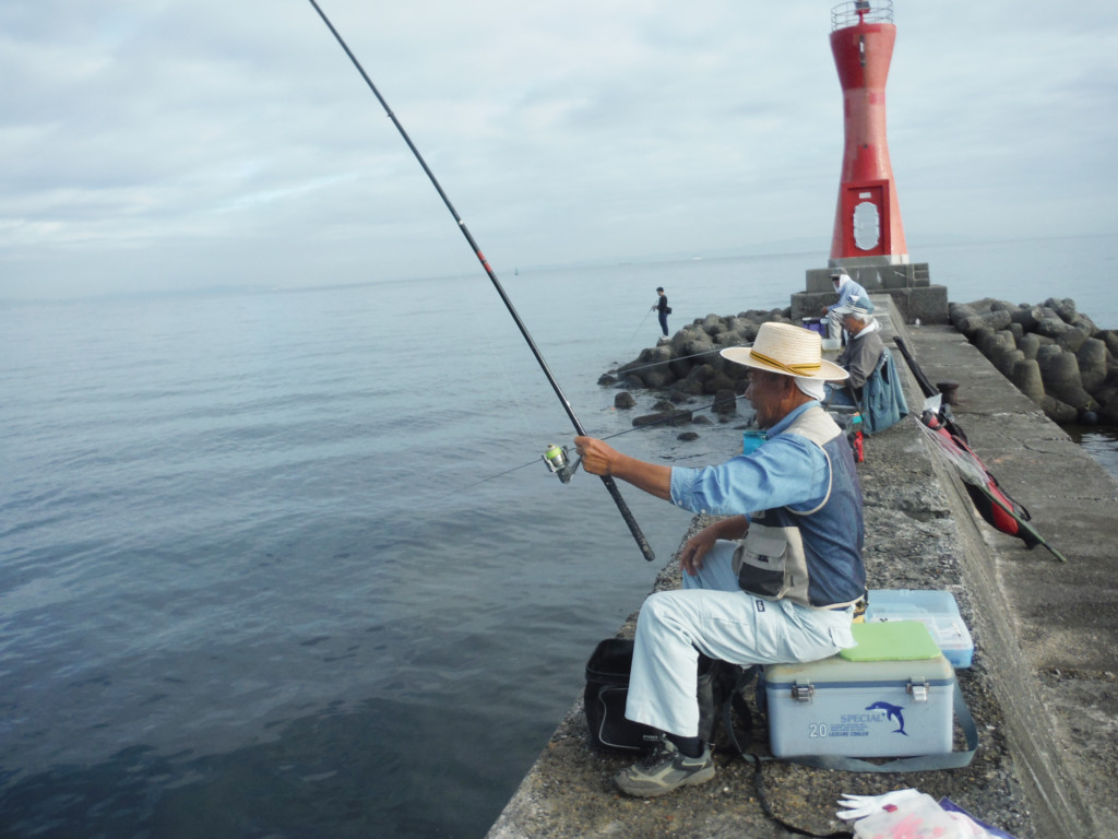 夜が明けて間もなくの6時頃、赤灯波止へ行くと、先端近くの好ポイントには、紀州釣りの人が3人並んでいた。