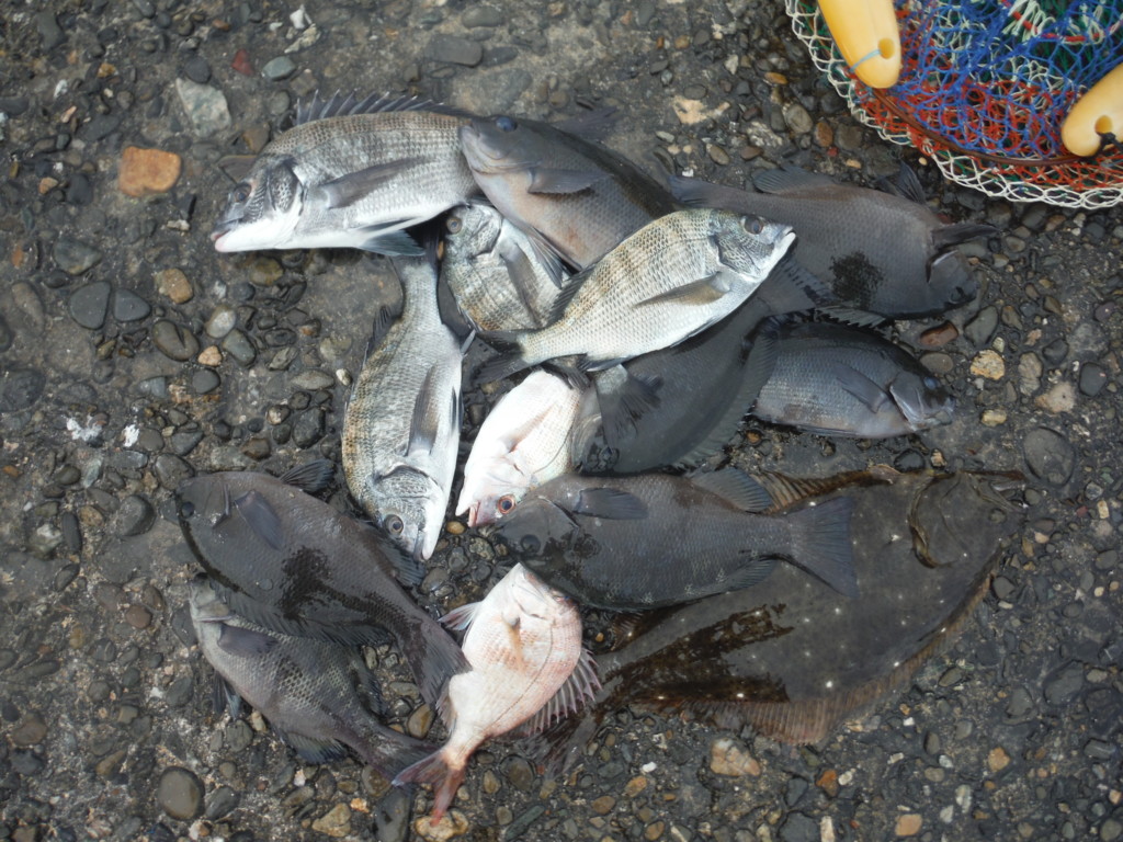 波止釣りの秋だけあって、チヌ、グレ、マダイ、サンバソウ、ヒラメの五目釣りであった。